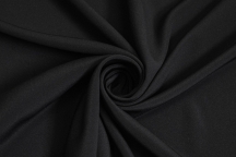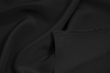 Текстурированный натуральный шелк с добавлением ацетатной нити из коллекции Fabiana Filippi нежного классического чёрного цвета, имеет матовую креповую фактуру и немного зернистую поверхность с еле заметным переливом блеска при движении полотна. Шелк обладает множеством преимуществ благодаря смесовому составу. Он более износостойкий в повседневной носке, проще в уходе, обладает меньшей сминаемостью в сравнении с чистым, 100% натуральным составом. Креповое переплетение и немного рыхловатая, мясистая фактура позволяет получить эффектную игру складок и драпировок в динамике ткани. Плотность ближе к средней, не прозрачна, платье и юбка из этой ткани не требуют подкладки. При декатировке фактурность ткани возрастает, что необходимо учитывать при расчете нужного метража. Брючные комплекты на тонкой подкладке, офисные блузы, эффектные платья для выпускного вечера, изделия со множеством драпировок, складок, воланов будет наиболее эффектно смотреться из смесового шелка.