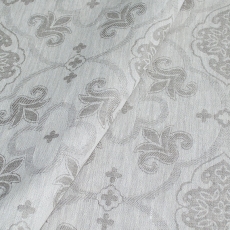 Достаточно плотная однотонная жаккардовая ткань с орнаментом натурального цвета. Ткань выглядит очень добротной и дорогой. Подойдёт для изготовления штор, скатертей, покрывал.