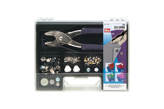 Набор Vario Plus позволяет устанавливать блочки, кнопки, люверсы. При необходимости ассортимент фурнитуры и насадок можно пополнить.
