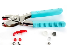 Универсальные щипцы VARIO Prym Love бирюзового цвета. Щипцы позволяют в домашних условиях устанавливать кнопки, блочки, люверсы, заклепки. Удобные нескользящие ручки. В комплекте прилагаются насадки для пробивания отверстий диаметром 3 мм и 4 мм, а также насадка для установки кнопок Color Snaps.