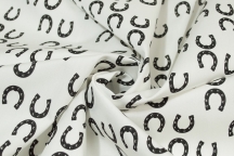 Отличного качества хлопок-поплин от легендарного бренда Dolce & Gabbana! Принт оригинальный и спокойный - подковки на натурально-белом фоне. Хлопок - тонкий, шелковистый, не тянется, очень приятный на ощупь, с гладкой матовой поверхностью, драпируется в средние складки, немного держит форму, не просвечивает. Для летних платьев, сарафанов, пышных юбок, топов, брючных и юбочных ансамблей, для лёгких летних брюк.